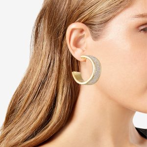 Blending a classic hoop design with a modern twist. featuring a C shape adorned with dazzling crystal embellishments. The goldtone finish enhances their elegance. making these earrings a versatile and stylish choice for any occasion.