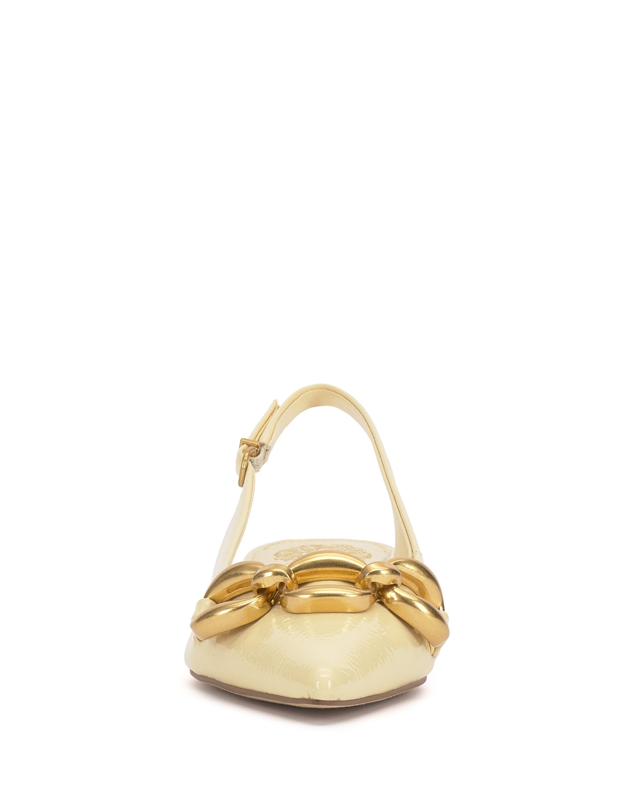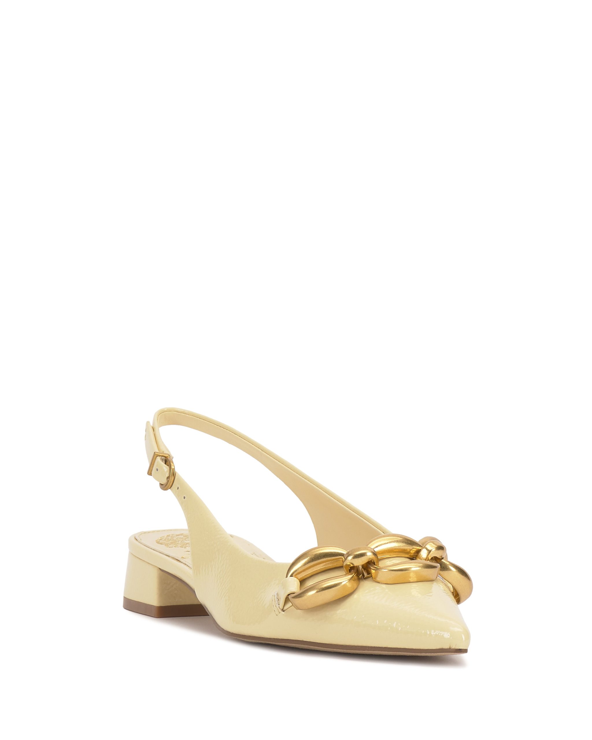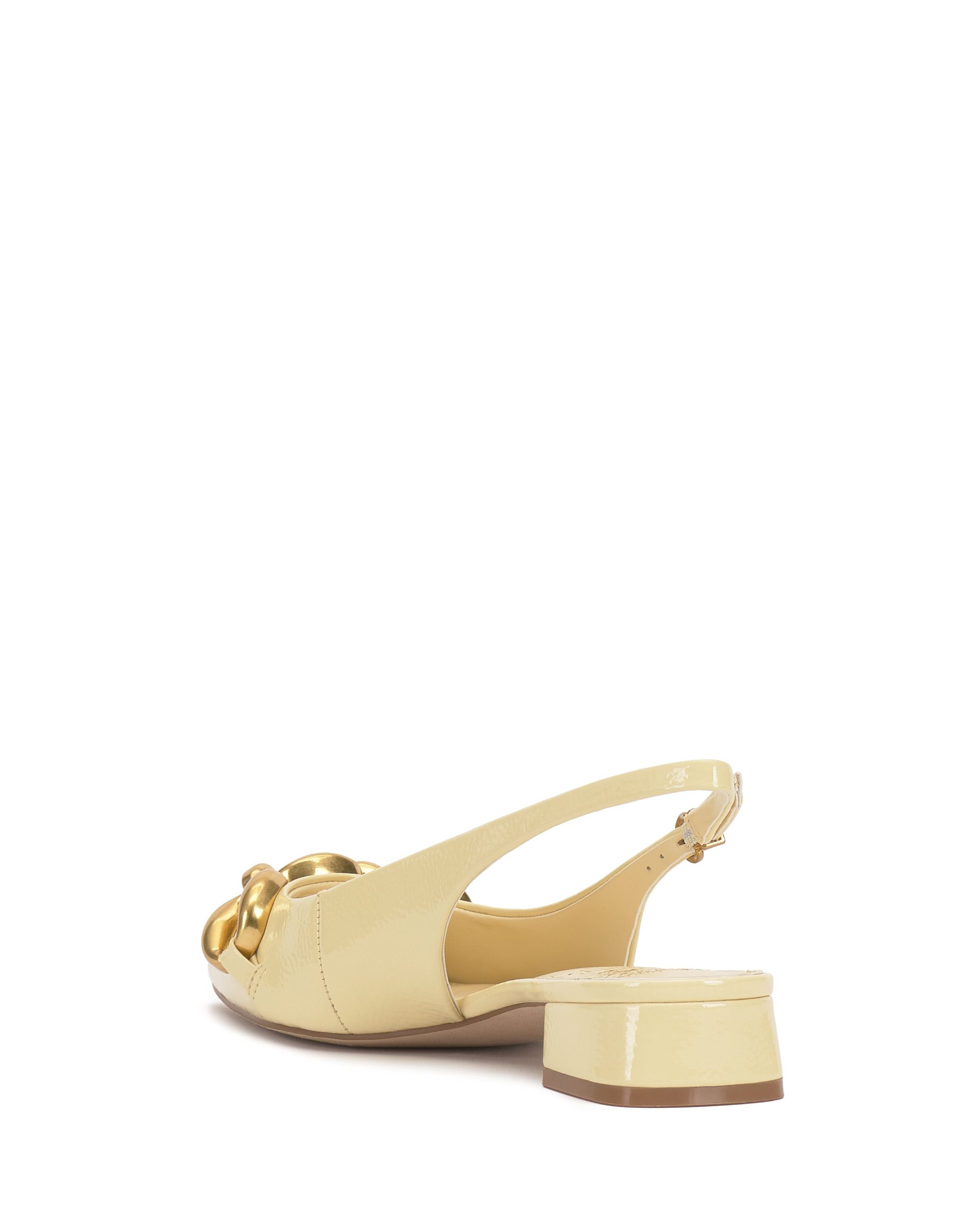 Featuring an oversized chain accent and low block heel. the Valiey pump stands out in your slingback collection. The sharp pointed toe adds a fierce finish to this pair.